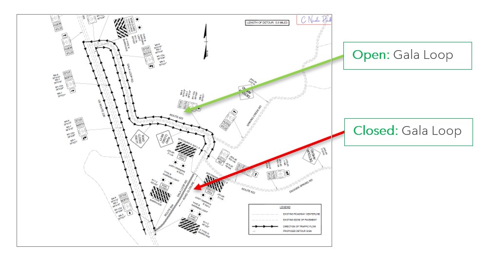 Gala Loop Road: will remain open for use on the north portion to Route 220. The south portion to Route 220 will be closed, however, access to the Galatia Evangelical Presbyterian Church will remain open during the closure.